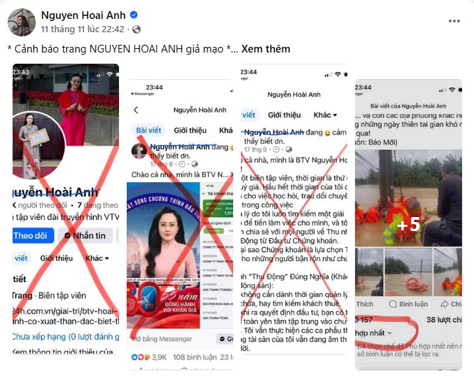 Mới đây, BTV Hoài Anh (VTV) đã đăng tải thông báo khẩn trên trang cá nhân, cảnh báo tình trạng tài khoản mạo danh ngày càng tinh vi. Theo cô, nhiều trang Facebook dùng tên và hình ảnh của mình nhưng vẫn được gắn “tích xanh” như tài khoản chính chủ, khiến khán giả rất dễ nhầm lẫn.