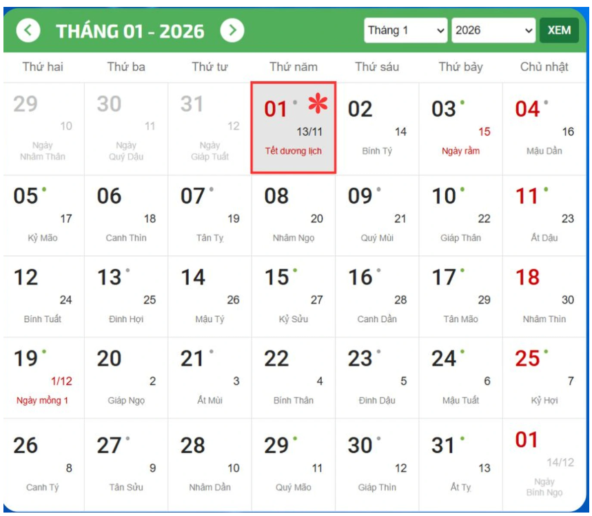 Dịp Tết Dương lịch năm 2026 rơi vào thứ năm, ngày 1/1/2026. Như vậy, cán bộ, công chức và người lao động được nghỉ 1 ngày.